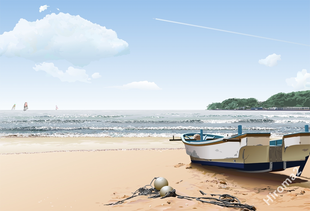 鎌倉駅から歩いて15分程度で材木座海岸に到着。砂浜に古びた漁船が・。波の音が心地よいです。