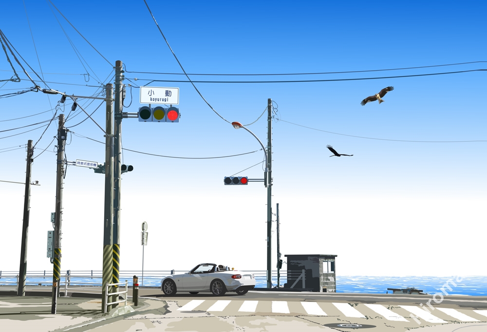 赤信号で停車した車の先に青い海が・・。綺麗な風景だったので車の中から急いでシャッターを切りました。