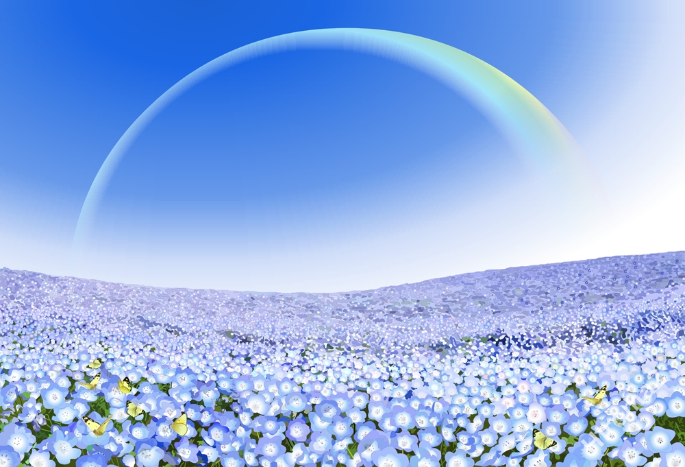 ひたち海浜公園みはらしの丘一面に染まるネモフィラを描いてみました。和名で瑠璃唐草(るりからくさ)というそうです。