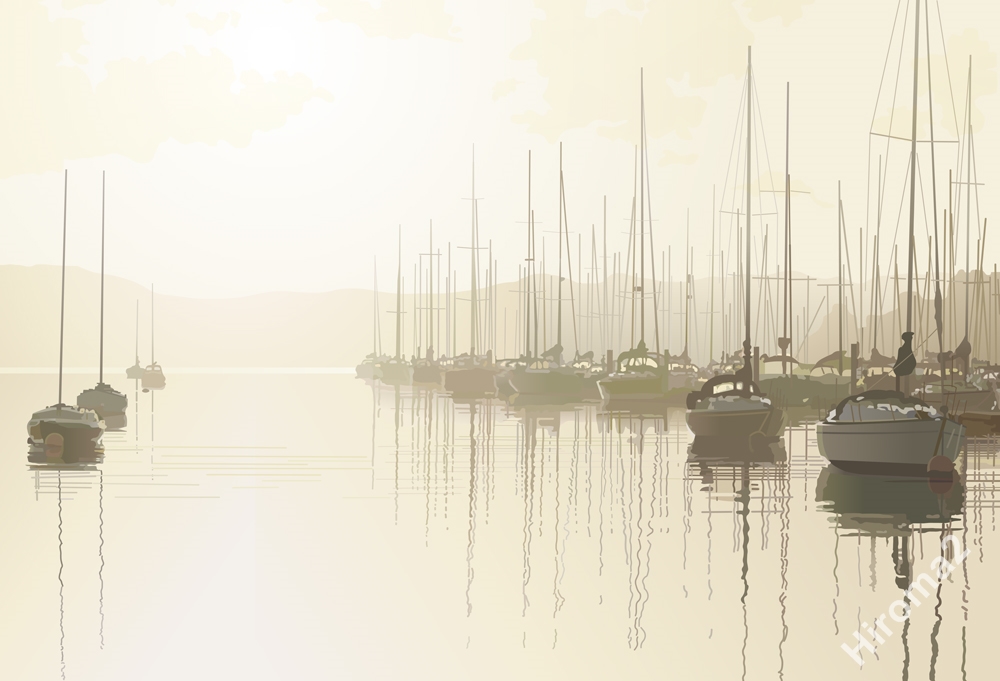 朝もやの中を漂うヨットが幻想的です。淡い色合いで描いてみました。