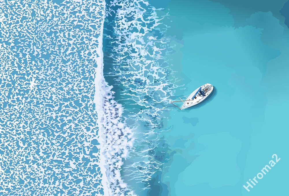 蒼い波間に浮かぶヨットを描いてみました。ここはバリ島のレギャンビーチ。