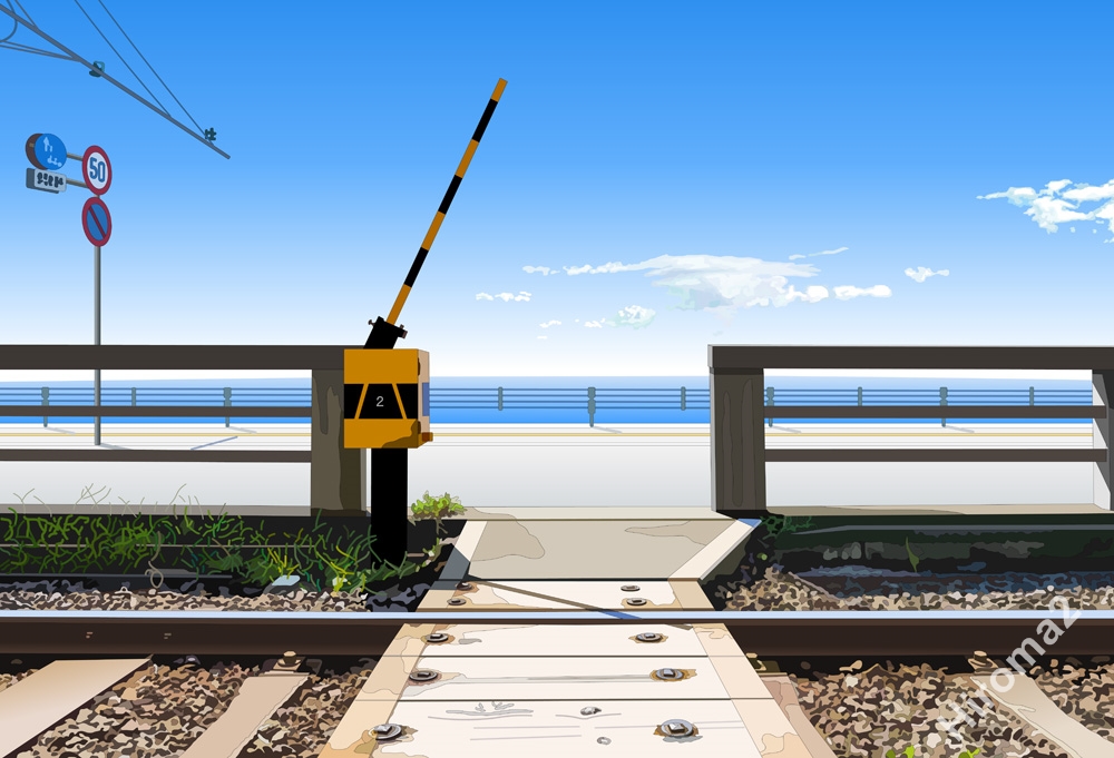 スラムダンクで有名な鎌倉高校前駅。ホームの藤沢側出口を抜けるととても小さな踏切が・・。踏切の向こうに綺麗な海が見えました