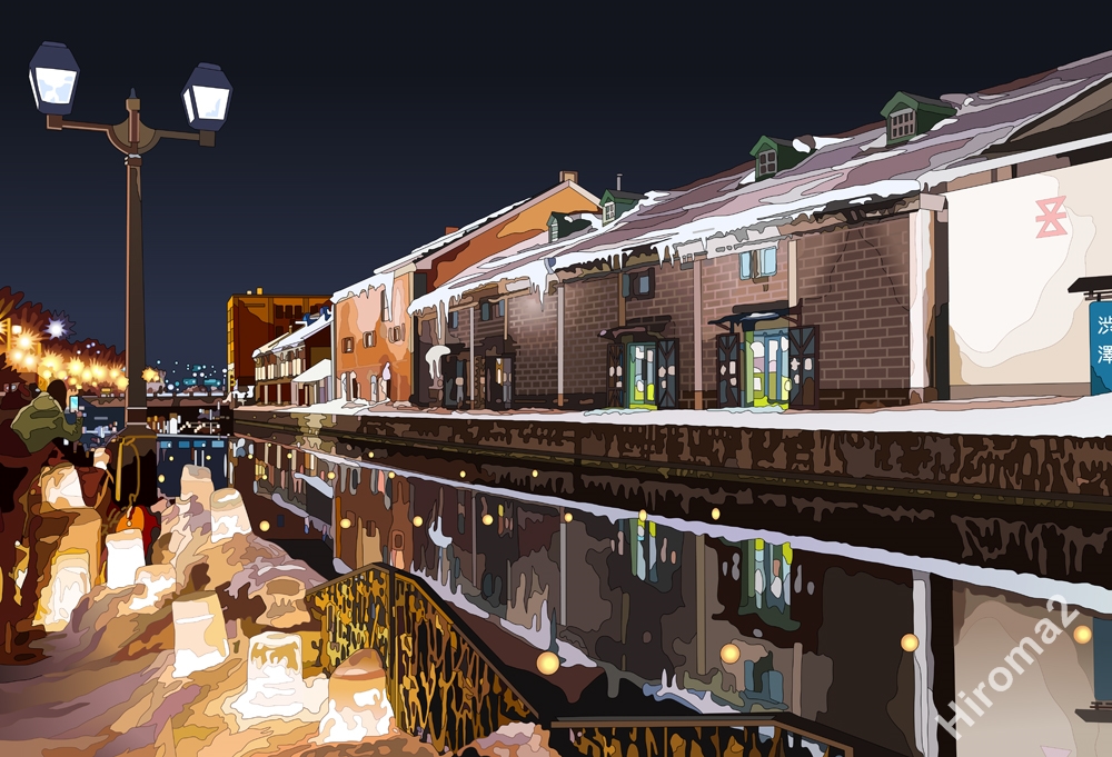 ここは北海道の小樽運河。冬になると石造倉庫や歩道に雪が積もり、いかにも北国らしい景色です。