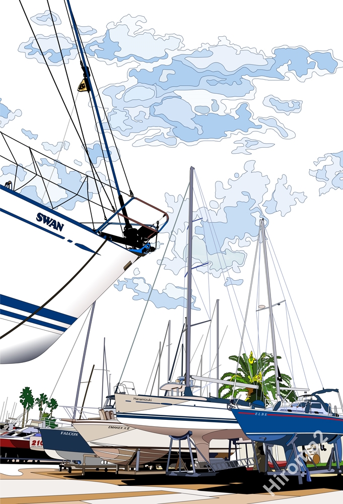 南欧風のマンションの敷地に沢山のヨットが規律正しく並んでました。奥に見えた綺麗なレストランも気になります。かなり明るめに描いてみました。