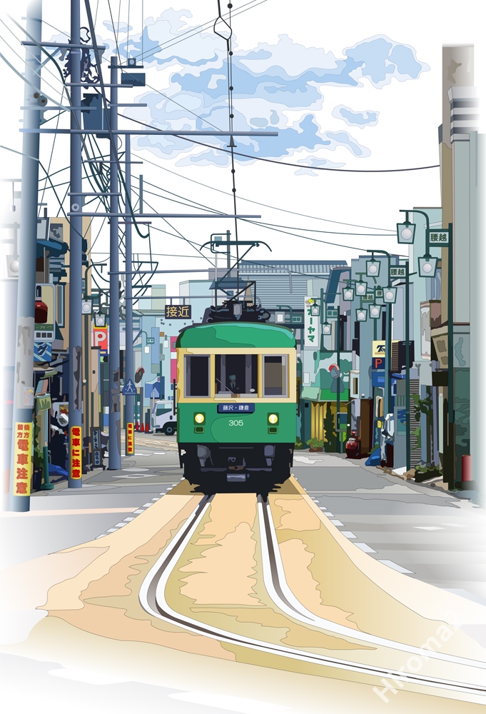 商店街の真ん中を走る江ノ電を描いてみました。ここは鎌倉のはずれに位置する腰越商店街です。