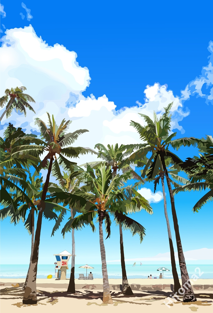 ホノルルの中心にあるワイキキビーチ。真っ直ぐに伸びたヤシの木と白い海辺のコントラストが良い感じです。