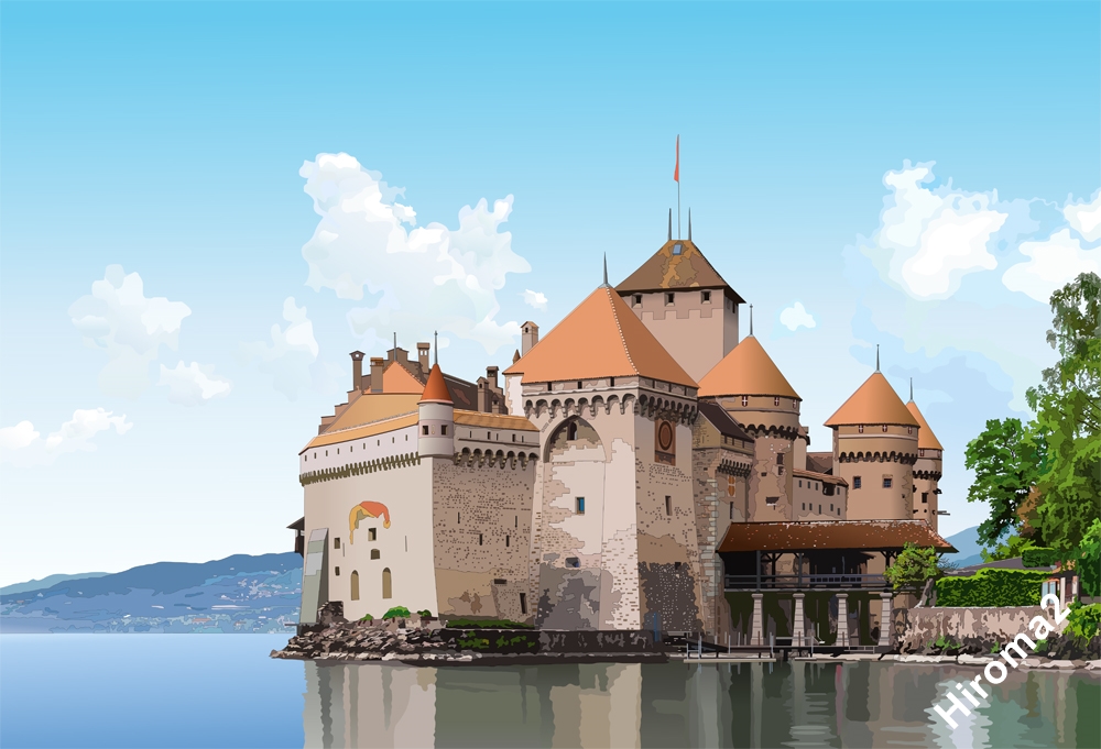 スイス・レマン湖の上に突き出た岩盤の上に立つシヨン城。スイスで最も訪問者が多い歴史的建造物のようです。