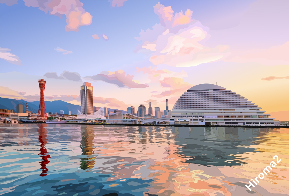 ここは神戸ポートタワー、神戸海洋博物館、メリケンパークオリエンタルホテルを一望できる夕暮れの景色を描いてみました。