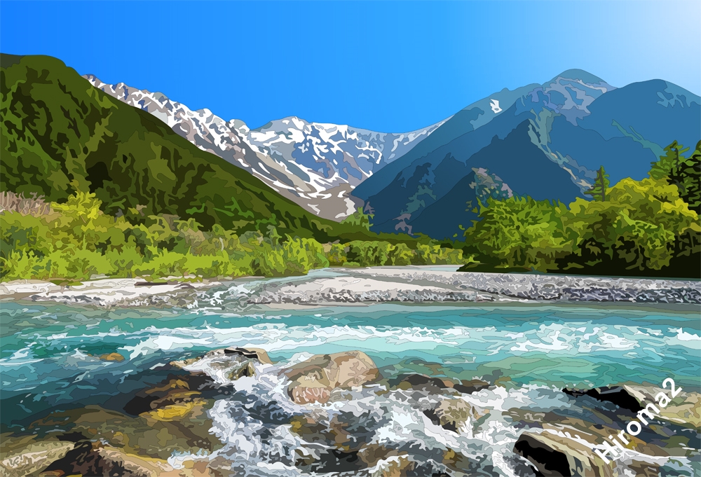 長野県松本市にある標高約1500メートルの山岳景勝地。残雪の穂高連峰が望める河童橋周辺の絶景です。